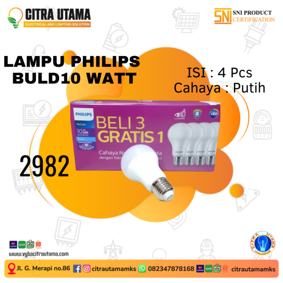 "Terangi rumah Anda dengan kecerahan yang hemat energi menggunakan Philips paket 10 watt.