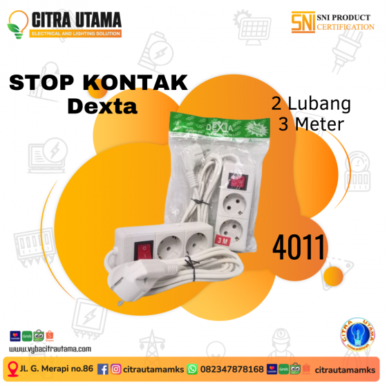 "Fleksibilitas yang tak terbantahkan! Stop kontak Dexta 2 lubang dengan kabel panjang 3 meter, memberikan kebebasan dalam menata peralatan listrik Anda."