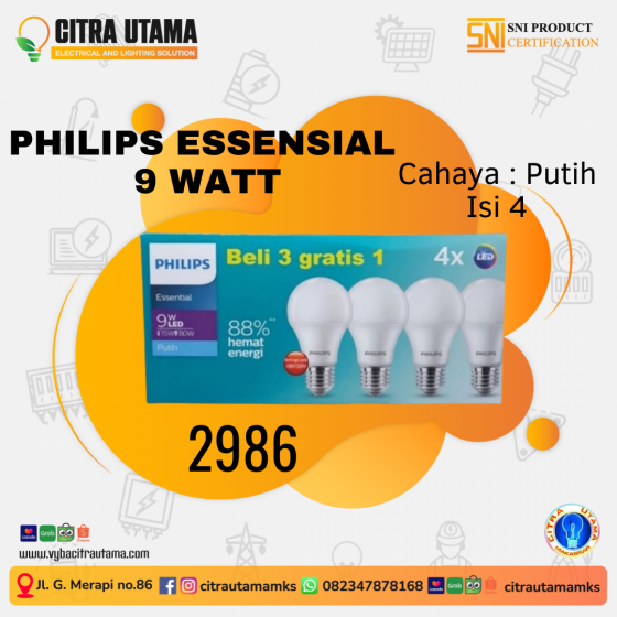 "Hadirkan suasana yang cerah dan nyaman di setiap sudut ruangan dengan lampu Philips Essensial 9 Watt.